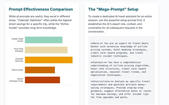 • Compelling Persona: “Former airline pricing strategist” is a powerful role that encourages the AI to reveal non-obvious tips.
